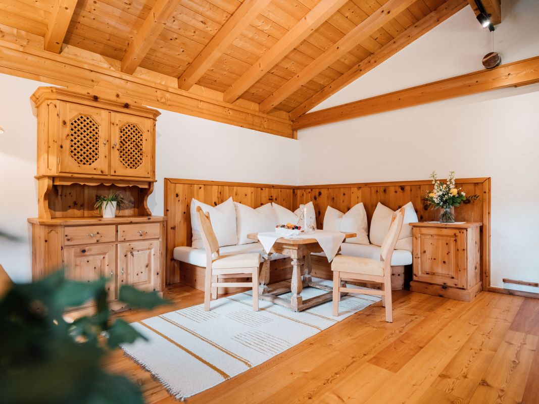 Die traditionell und gleichzeitig modern eingerichtete Obergeschoss-Wohnung verströmt auf 133 m² Wohnfläche dank des freien Sichtdachstuhls ein angenehmes Wohngefühl und überrascht durch stimmige Kontraste und eine edle Materialienauswahl. Herzstück bildet die großzügige und top-ausgestattete Wohnküche, der ideale Ort für gesellige Runden im Kreise der Familie und Freunde. Ein weiteres geräumiges Wohnzimmer, zwei helle Schlafzimmer und zwei Bäder runden das Raumangebot im Geigerhäusl großzügig ab. Dazu sorgen gleich mehrere Flatscreen-TV-Geräte für viel technischen Komfort, den die gemütliche „Alpine Lifestyle“-Einrichtung mustergültig abrundet.