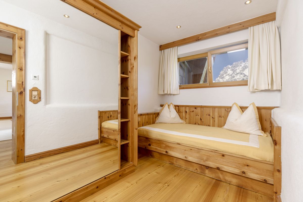 Large living room & bedroom with dining table, cosy seating area and Swiss stone pine double bed, children’s room with large cosy bed, 2nd small children’s bedroom with single bed, two bathrooms, each with their own washbasin and WC, one with bathtub and one with shower, telephone, Wi-Fi, mini-bar, safe, flatscreen TV, coffee station, air-con, roof-top terrace with view on the ‘Wilder Kaiser’ mountain